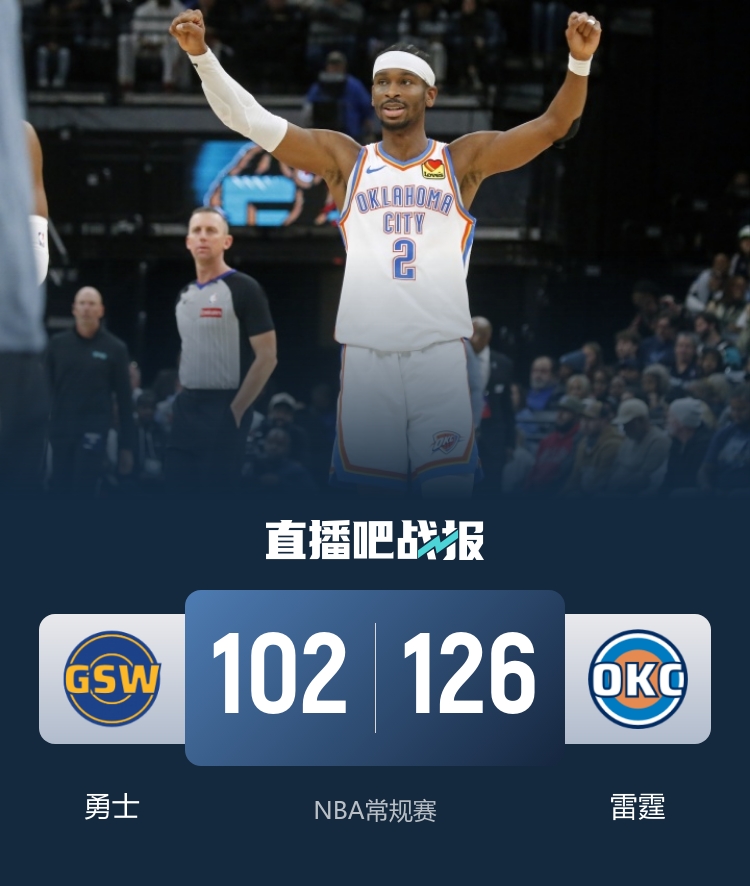 雷霆(11-1):亚历山大28分5板11助3断、霍姆格伦23分11板2助、乔18分1板1助、米切尔17分3板2助、杰林·威廉姆斯12分6板5助、哈尔滕施泰因8分7板2助、卡鲁索8分2板3助5断、吉昂5分1板、巴恩海泽4分3板、华莱士3分1板2助、扬布拉德1助。
