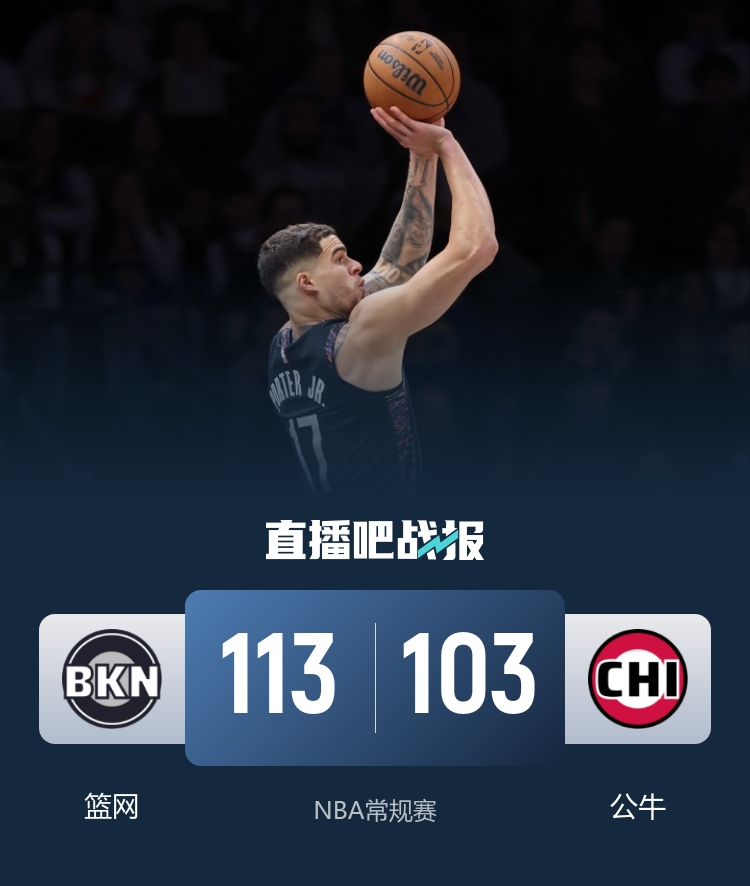 此役一上来两队早早找到节奏,吉迪和武切维奇率队多点开花,小波特连投带罚单节14分强势回应,篮网后程发力实现反超,首节结束时篮网领先5分,次节回来,吉迪连造杀伤率队追分,但篮网稳扎稳打保持优势,半场战罢,篮网已经领先10分。易边再战后两队延续状态火热对攻,公牛全员发力内外结合,但小波特无人可挡予取予求,三节结束后篮网依然领先8分,末节上来,公牛没有放弃继续追分,但无法打出高潮逆转无望,最终篮网113-103送对手5连败。