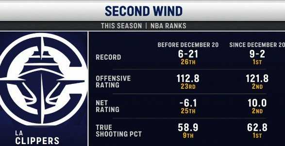 快船主场迎战黄蜂,转播方对比了快船前27场和近11场各项数据对比。