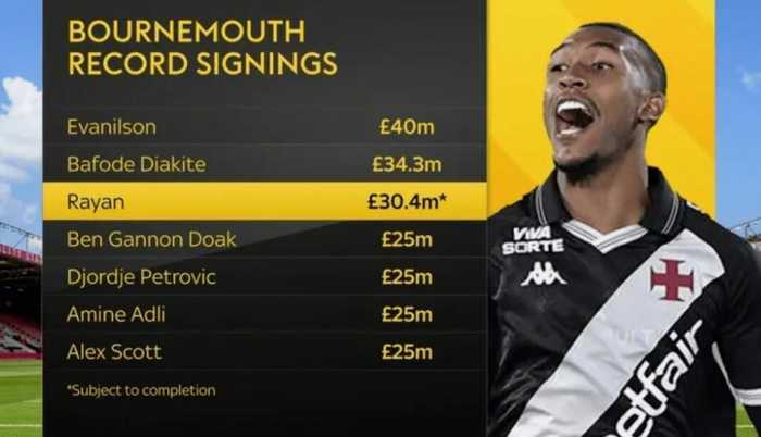 据此前多家媒体的报道,伯恩茅斯将签下瓦斯科达伽马19岁中锋拉扬,而天空体育表示转会费为3040万镑。该媒体也统计了伯恩茅斯队史引援花费榜。