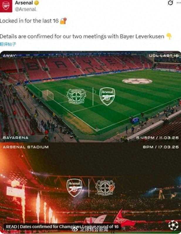 官方:阿森纳将在欧冠八分之一决赛中对阵勒沃库森。